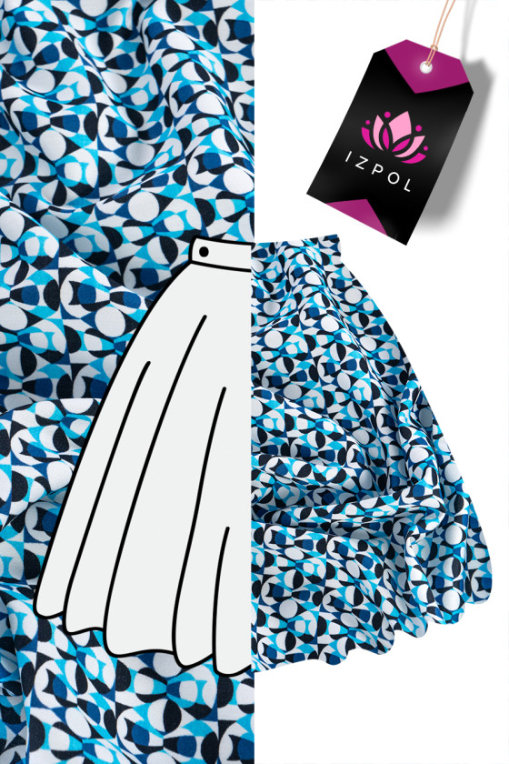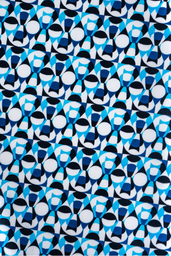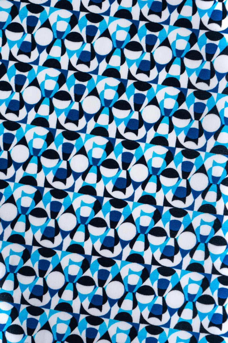 Olasz ing pamut fehér, kis geometriai motívummal, fekete, búzavirág kék és kék. A szövet rugalmatlan, átlátszatlan, puha, nem gyűrődik sokat. Tökéletes ing, ruha vagy szoknya varrásához.
