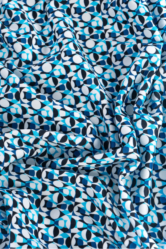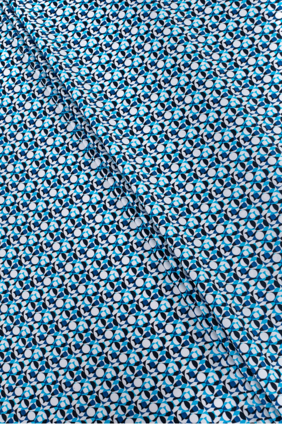 Italian shirt cotton in white with a fine geometric motif in black, cornflower and blue. The fabric is inflexible, opaque, soft, little creasing.