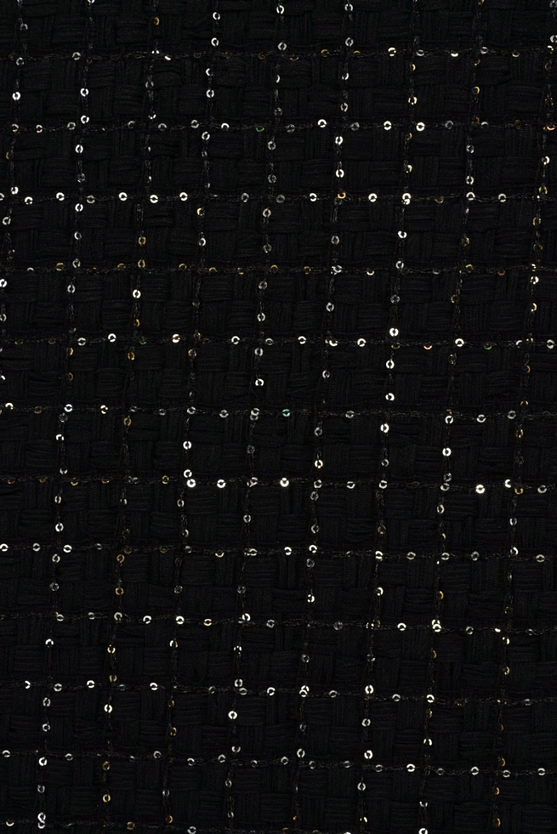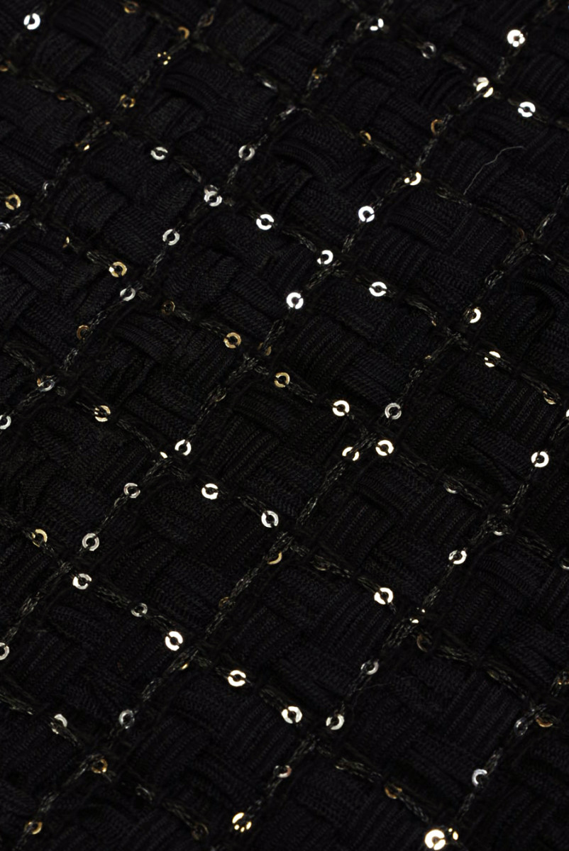 Italian chanel fabric in black decorated with small silver sequins. Sequins and a shiny single black thread create a pattern of a small, regular check, where one check is 1.5 cm * 1.5 cm. The whole is made in a basket weave of matte black thread in the form of a ribbon. The fabric is soft, light, non-elastic, thin but opaque, it will work very well for spring outfits. It can be used to create costumes, dresses, skirts or jackets.