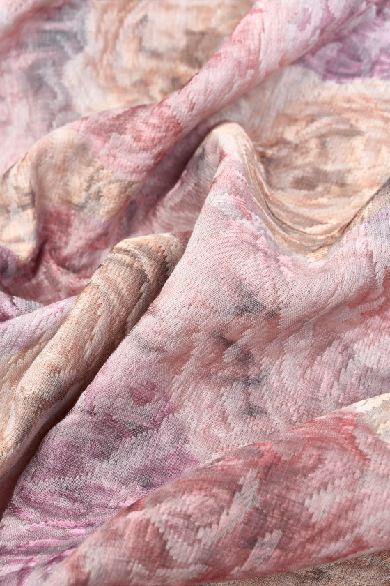 Italian jacquard costume fabric with large coral, heather, orange and salmon roses. The fabric has a convex structure, is soft, opaque, non-elastic. Roses are made in different sizes, from 8 cm to 13 cm. A beautiful proposition for people who like pastel and classic design.