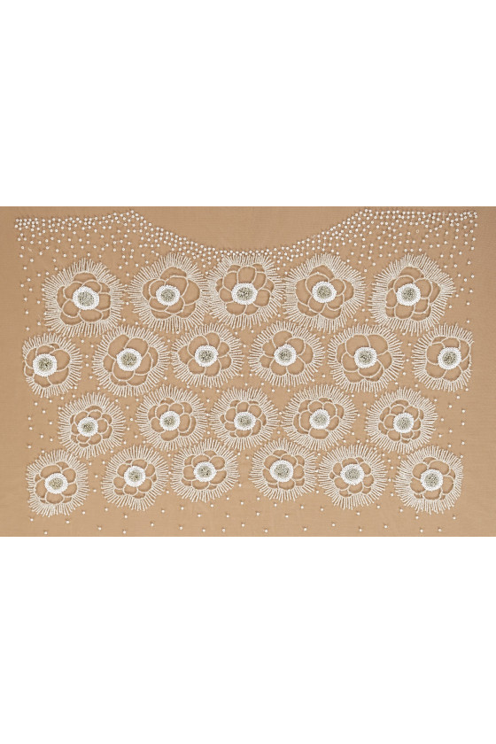 Italian wedding application in the form of a corset (blouse - front) in cream color with white and silver accessories. Beautiful motif of large flowers (9 cm) with transparent beads and silver-white sequins. The whole is sewn on soft tulle.