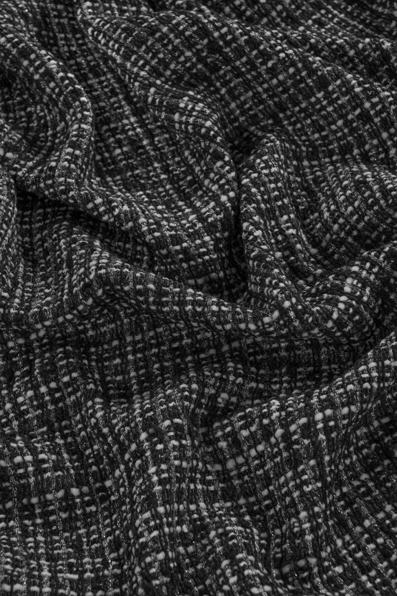 Italian chanel costume fabric in gray-cream color decorated with silver lurex thread. Medium-weight fabric with a slightly looser weave.