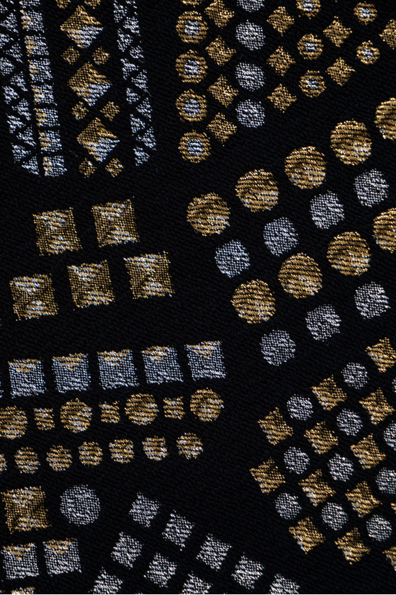 Italian chanel costume fabric in black with geometric motifs in silver and gold colors. Thicker fabric with a compact weave, non-elastic - ideal for sewing a costume, dress, jacket, skirt or coat.