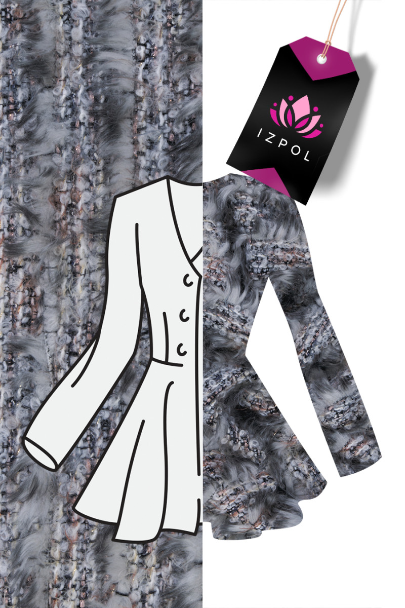 Exclusive, original chanel costume fabric in fashionable colors with woven faux fur. We recommend it for sewing jackets, vests, cardigans, ponchos or large scarves. It can also be used as a decorative material – for cushions or sofa covers. Natural cotton and wool threads ensure comfort of wearing. It requires the use of a lining, which can be selected in our store.