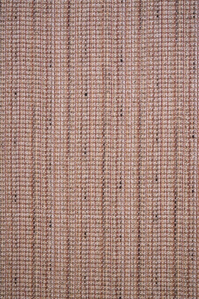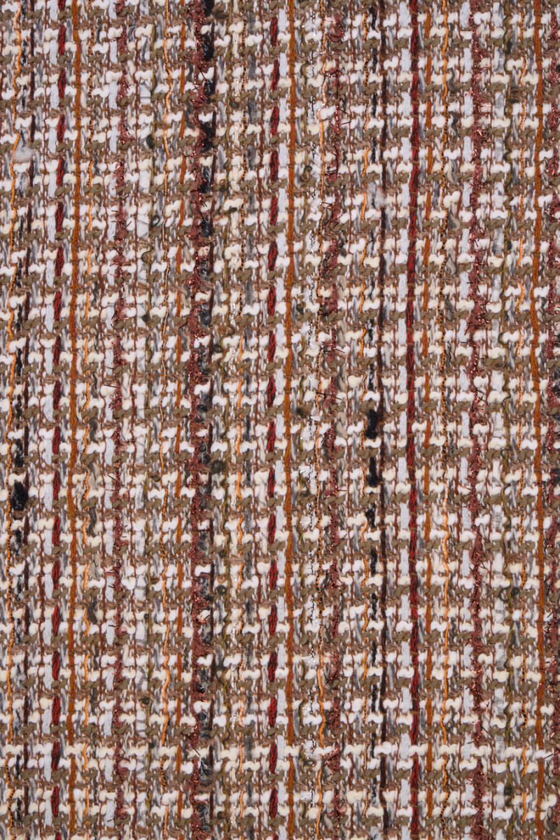 Italian chanel costume fabric in brown, cream and earthy beige colors, additionally enriched with shiny threads. The fabric is soft, medium thickness, made mainly of natural fibers, so it is very comfortable to wear, known for its original weave. It is perfect for sewing a costume, dress and a thin coat.