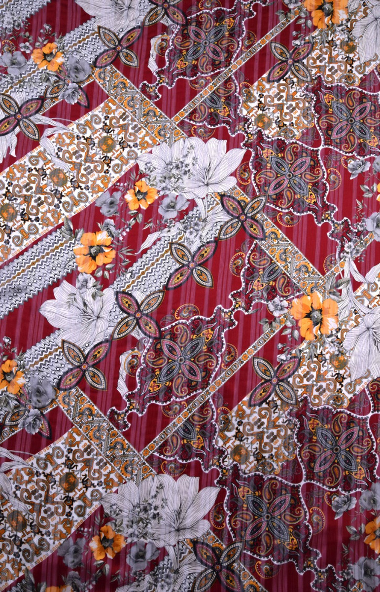 Polyester chiffon with an oriental pattern is a very delicate, airy and transparent fabric. Perfect for airy dresses, skirts, blouses or pareos. Non-elastic fabric. Colours: on a burgundy background (discreet stripes) pattern print in grey/yellow/ecru. The fabric is very effective.
