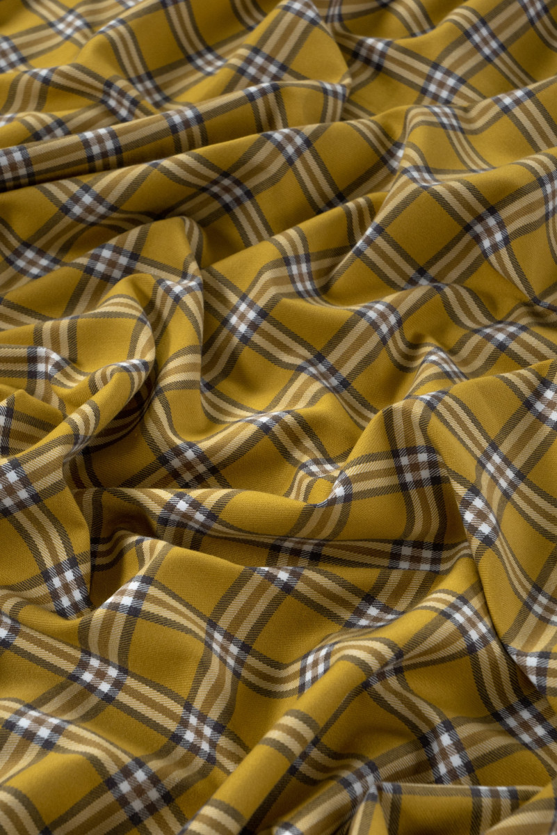 Italian costume fabric in beige and mustard with a check motif 2.5 - 3.5 cm in size. Soft, fleshy, slightly elastic fabric - a mixture of polyester, viscose and elastane.