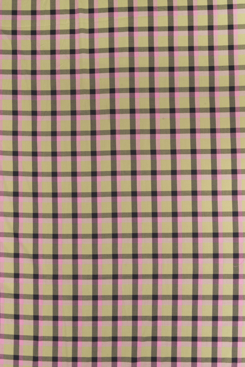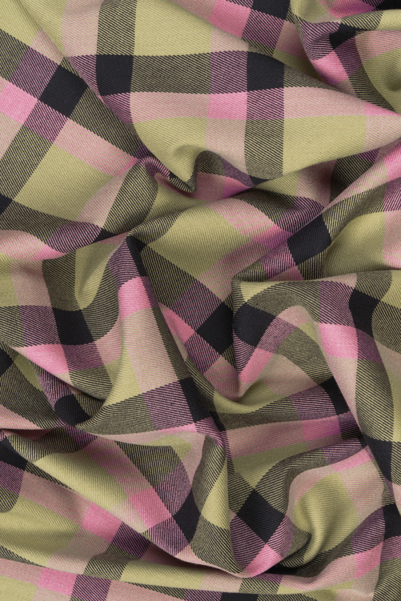 Italian costume fabric in olive green with a large trellis motif (10 cm) in black and pink. A beautiful color combination for people who follow the latest trends. Slightly elastic fabric with a compact weave and a smooth surface. A fantastic proposition for sewing a jacket, suit, classic dress or skirt.