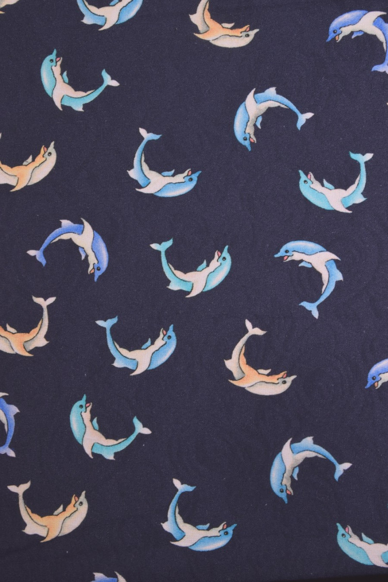 Thicker, navy blue jacquard cotton with a print of colorful dolphins (size about 4 cm). We recommend it for sewing dresses, pants, skirts, jackets.