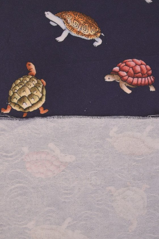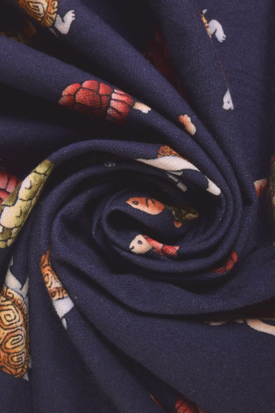 Thicker, navy blue jacquard cotton with a print of colorful turtles (size about 3.5-4 cm). We recommend it for sewing dresses, pants, skirts, jackets.