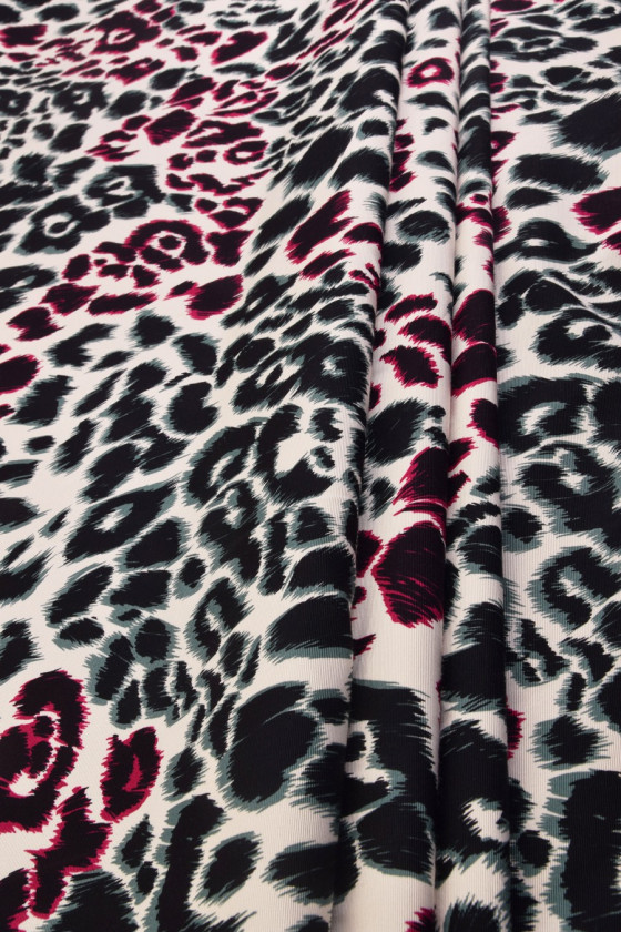 Thicker grosgrain fabric with a large, colorful leopard print - on a black with green and red ecru panther background. We recommend it for sewing skirts, jackets, jackets, coats. Stable fabric.