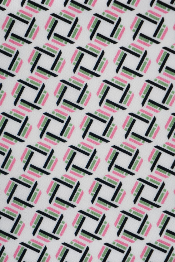 Italian, elastic shirt cotton with a small, geometric pattern (1.5 cm) in black with pink and green on a cream background. Perfect for sewing a shirt, blouse, dress.