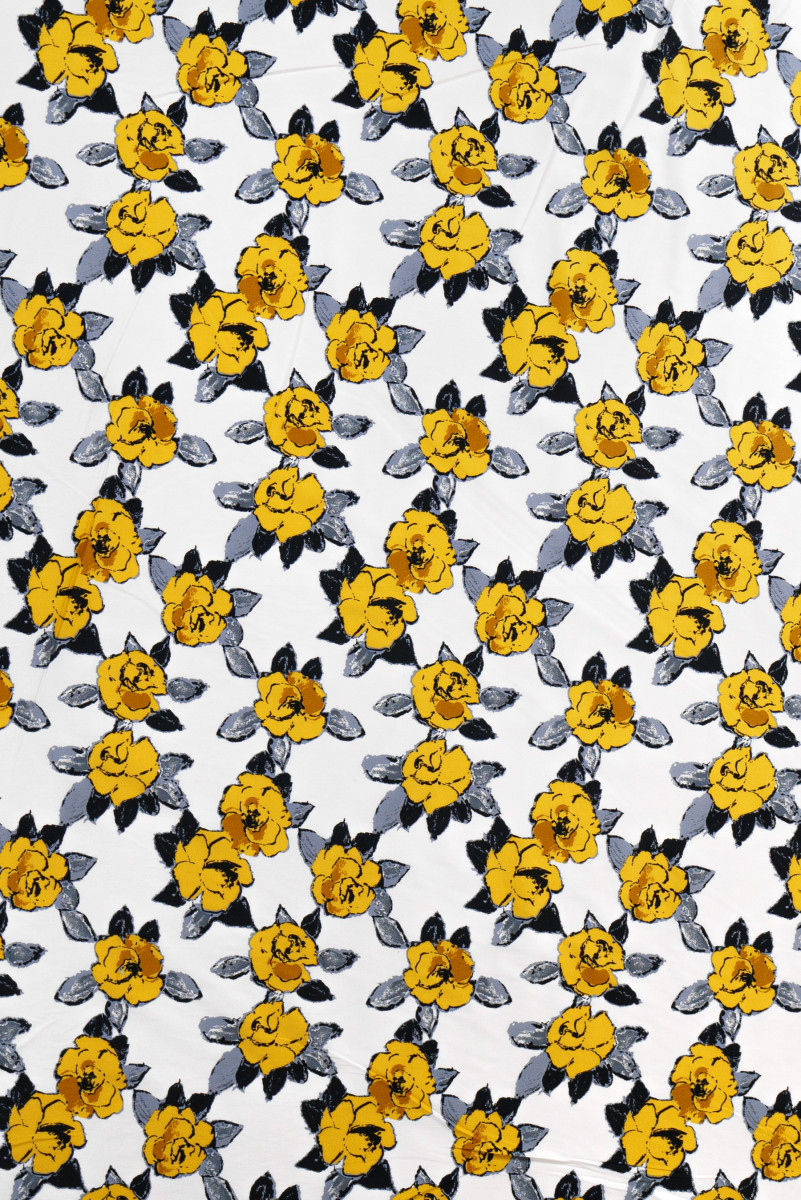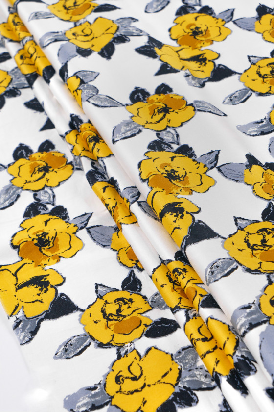 Italian cotton fabric with a motif of yellow and black flowers on a white background. Thicker, slightly stiff, elastic fabric - perfect for sewing a dress, skirt, pants.