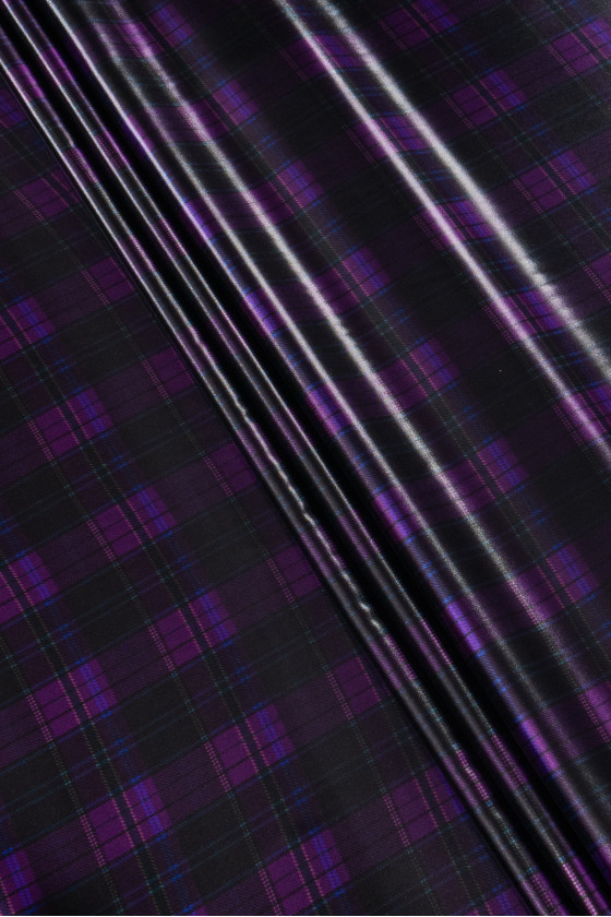 Italian cotton fabric with a shiny coating and wet look glitter. Black fabric with a purple-green check motif (5 cm). Thin, slightly stiff, non-elastic fabric - very original.