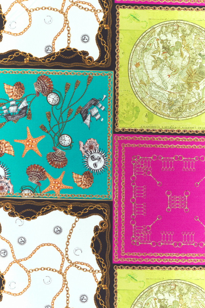 Italian shirt cotton, elastic with a motif of colorful squares 17 cm wide, which form a patchwork motif. The fabric is thin, elastic, opaque, slightly rigidly arranged.