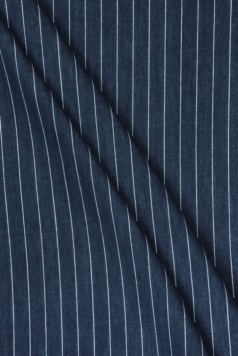 Italian 100% cotton fabric resembling navy blue jeans with a motif of narrow, white stripes. The straps are spaced every 1.5 cm. The fabric is thin but opaque, soft in the touch, inelastic and light. Perfect for shirts, blouses, dresses and looser pants. A fashionable proposition that is perfect for summer clothing.