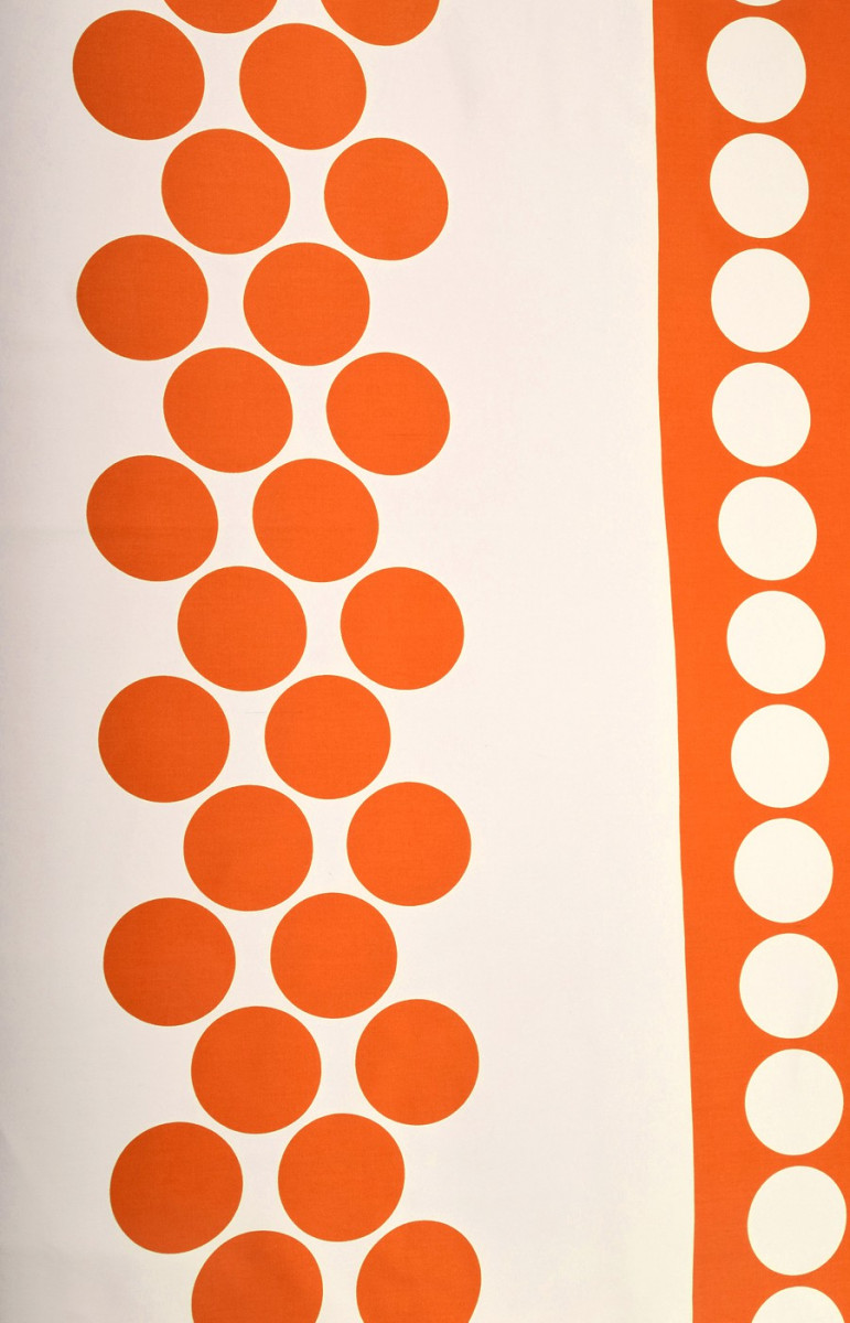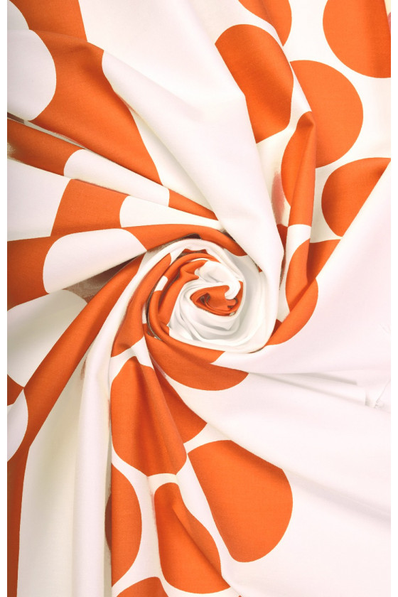 Thicker natural cotton with elastane in a coupon of 150 cm * 60 cm, lower waist - white circles (7.5 cm) on an orange background is 14 cm. recommended for sewing summer skirts, shorts, dresses.