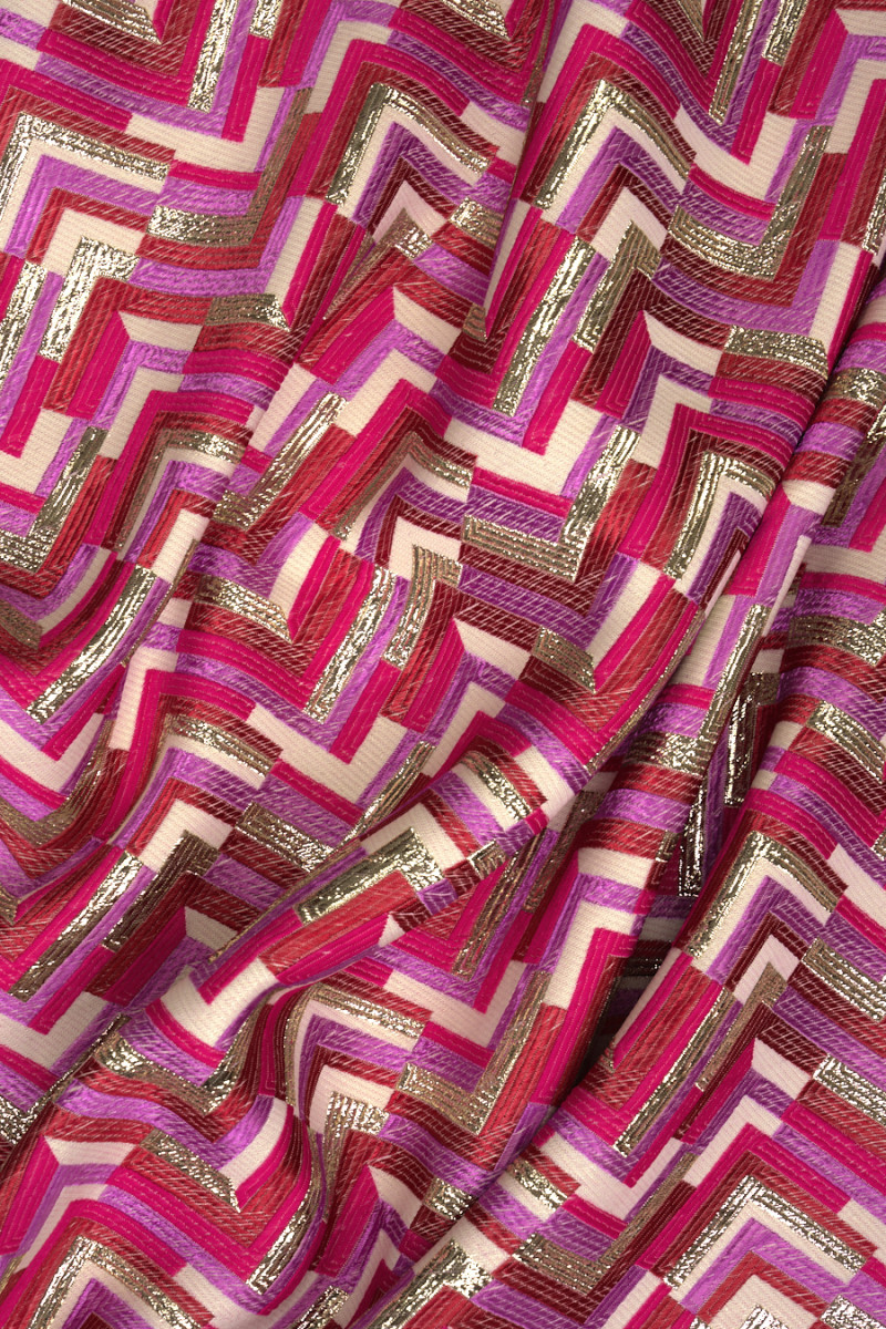 Italian costume fabric of jacquard type with a motif of colorful zigzags. The fabric is kept in pink, purple and beige colors, additionally decorated with gold lurex thread, which gives it elegance. The material has a slightly convex structure, it is soft, of medium thickness, covering. A beautiful proposition to sew a dress, skirt and jacket for special occasions.
