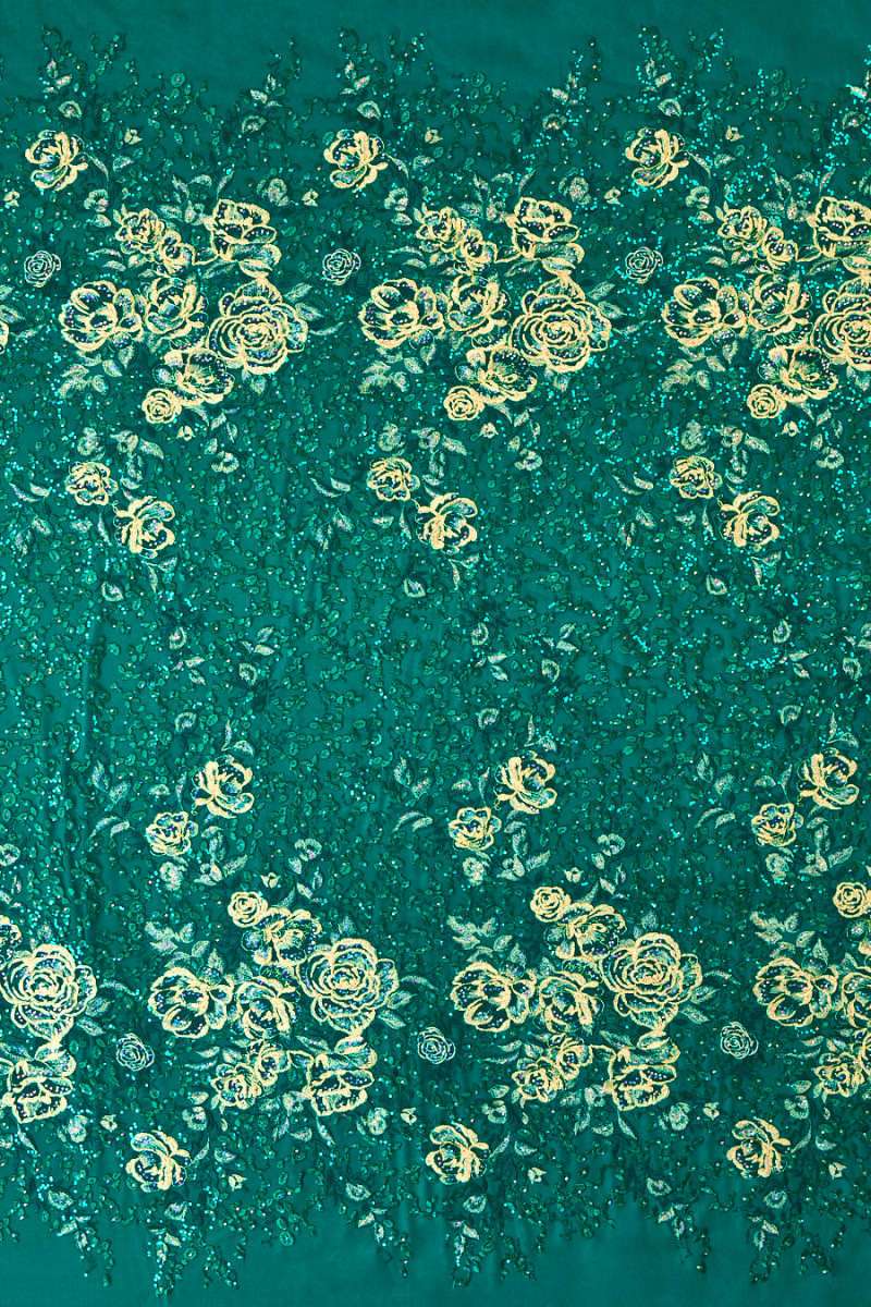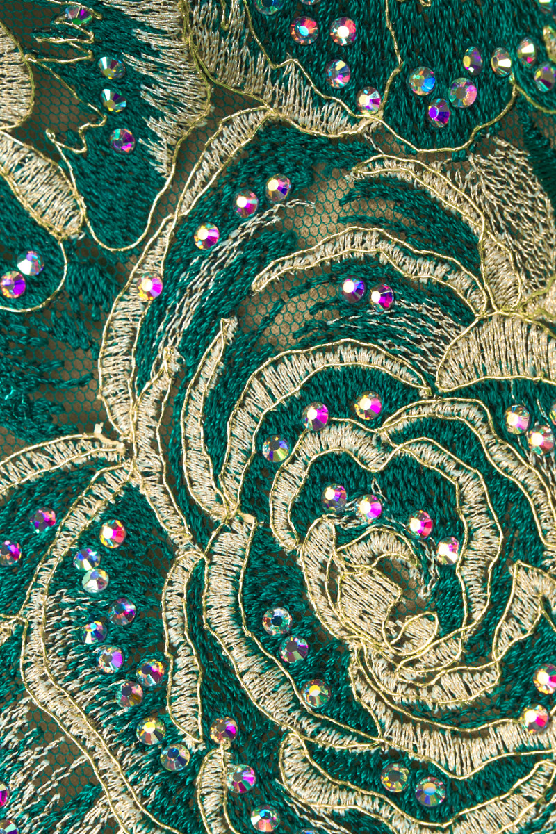 Italian stiff tulle with classic green eyelets with embroidered gold-colored roses and small green leaves, richly decorated with iridescent stones and small green sequins. The embroidery thickens towards the two edges, so we recommend sewing around the perimeter. The fabric is very effective, transparent (requires lining), inflexible, light. Stones placed on the fabric shine beautifully, creating an exclusive look of the fabric A fantastic proposition for sewing an evening dress, skirt or blouse in a very interesting edition.