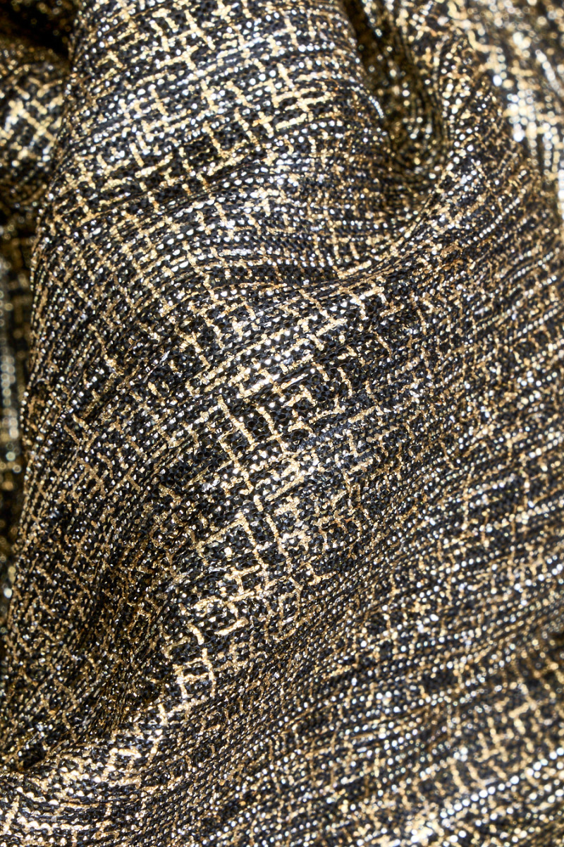 Impressive fine-pleated fabric in gold and black with a shimmering lurex thread woven in.