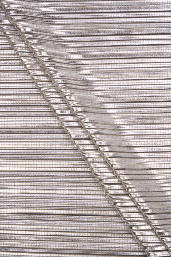Eye-catching pleated fabric in beige with densely laid, tiny, shiny squares in silver. The fabric is light, flowing, intensely shiny, which gives it a unique and exclusive look. Perfect for outgoing outfits.