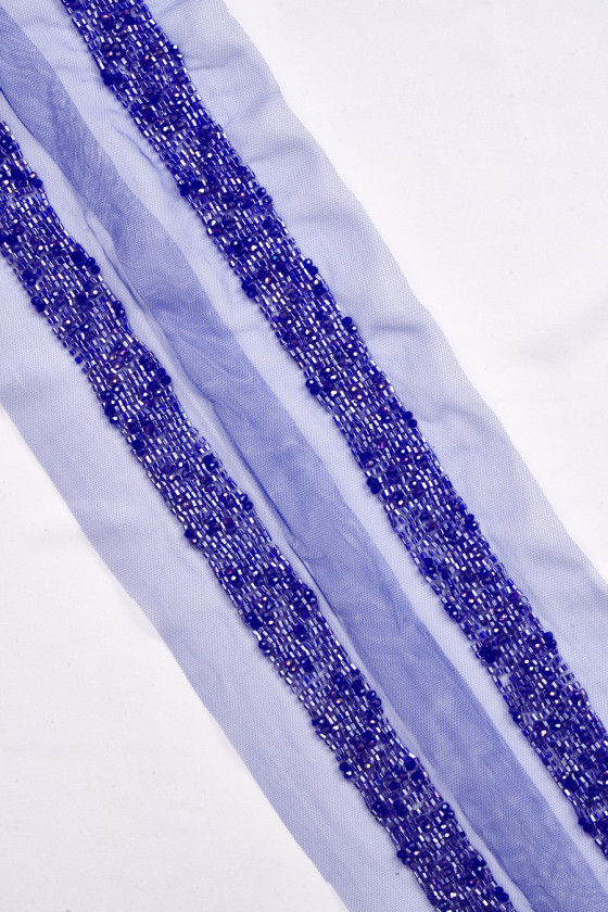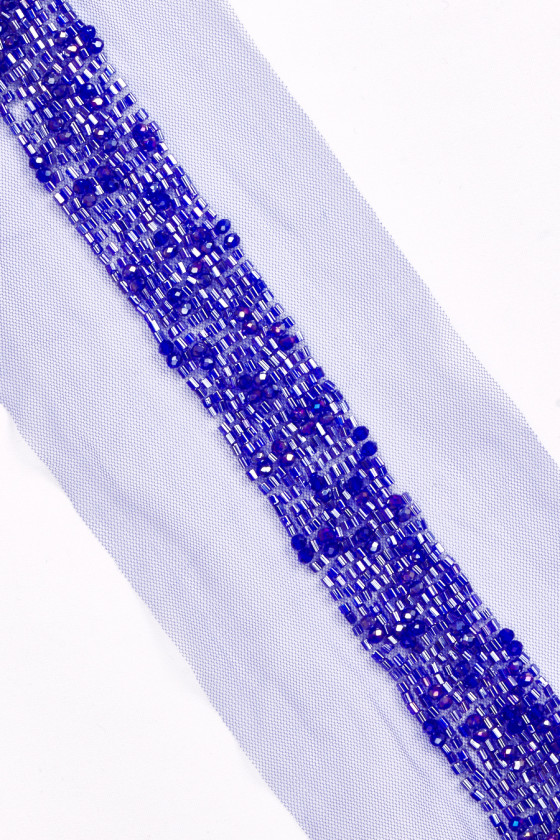 Italian cornflower blue haberdashery tape, 2.7 cm wide, richly decorated with beads. The tape is made of beads of two shapes, with a predominance of smaller ones in the shape of a cylinder. The whole thing is sewn on a tulle mesh in the color of the beads. A beautiful proposition to decorate an elegant dress, blouse or skirt.