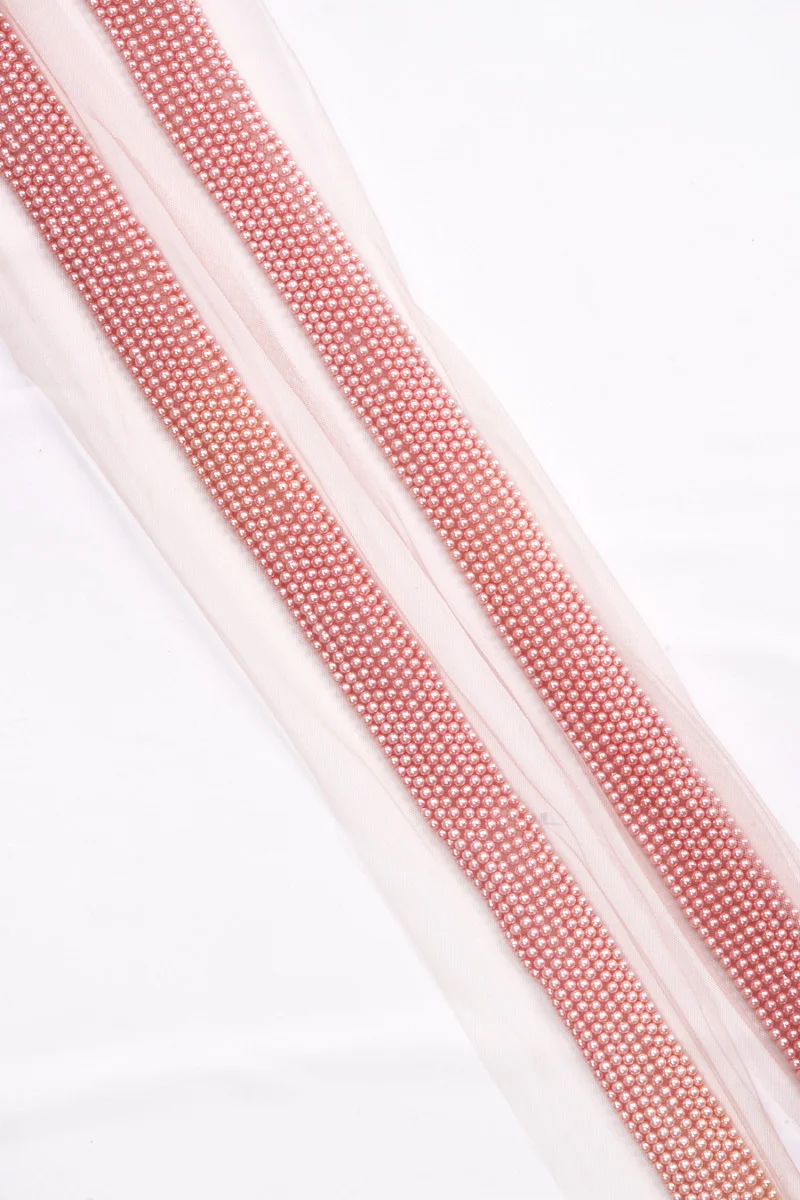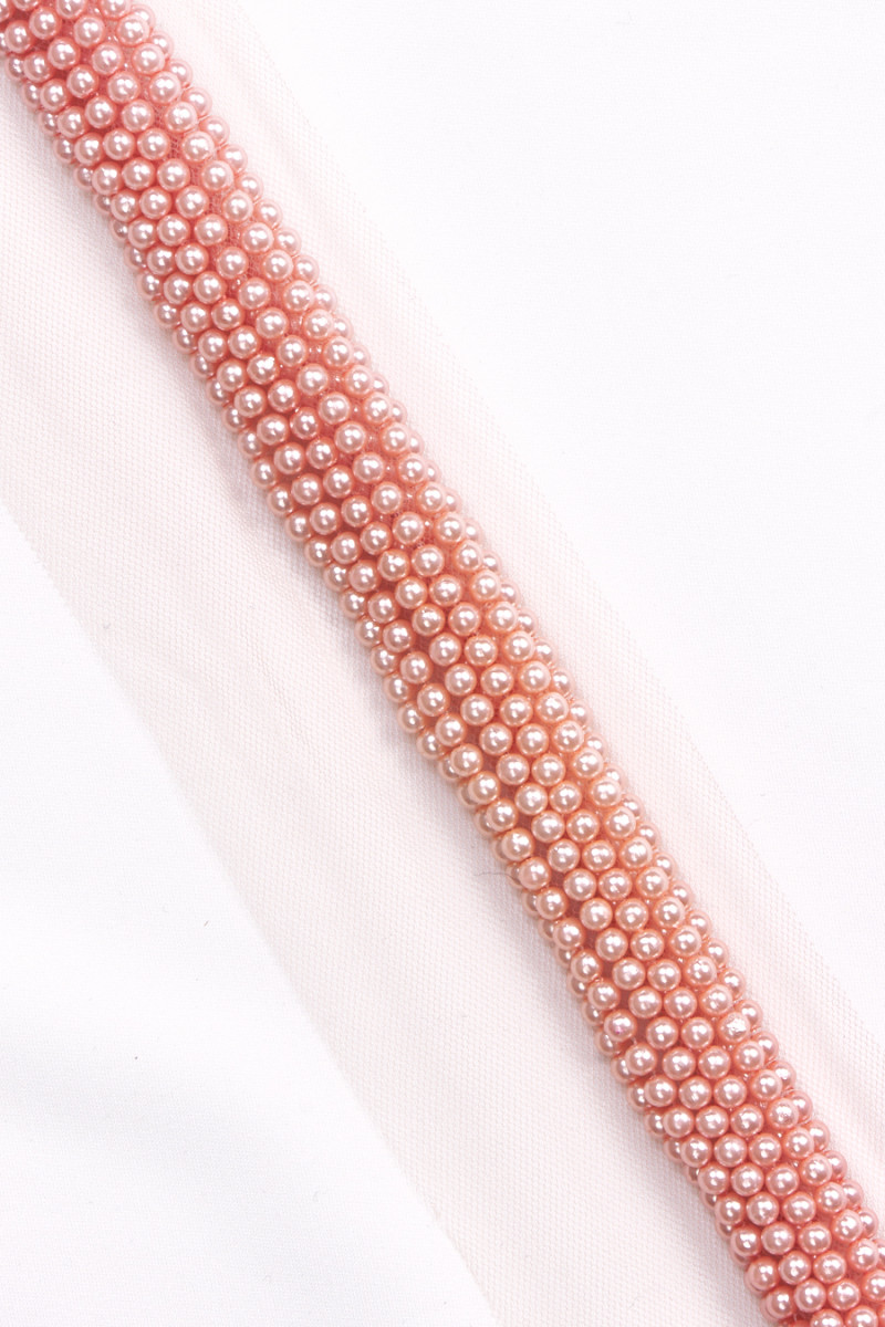 Italian salmon-coloured haberdashery tape, 2.9 cm wide, richly decorated with pearls. The whole thing is sewn on a tulle mesh in the color of the beads. A beautiful proposition to decorate an elegant dress, blouse or skirt.
