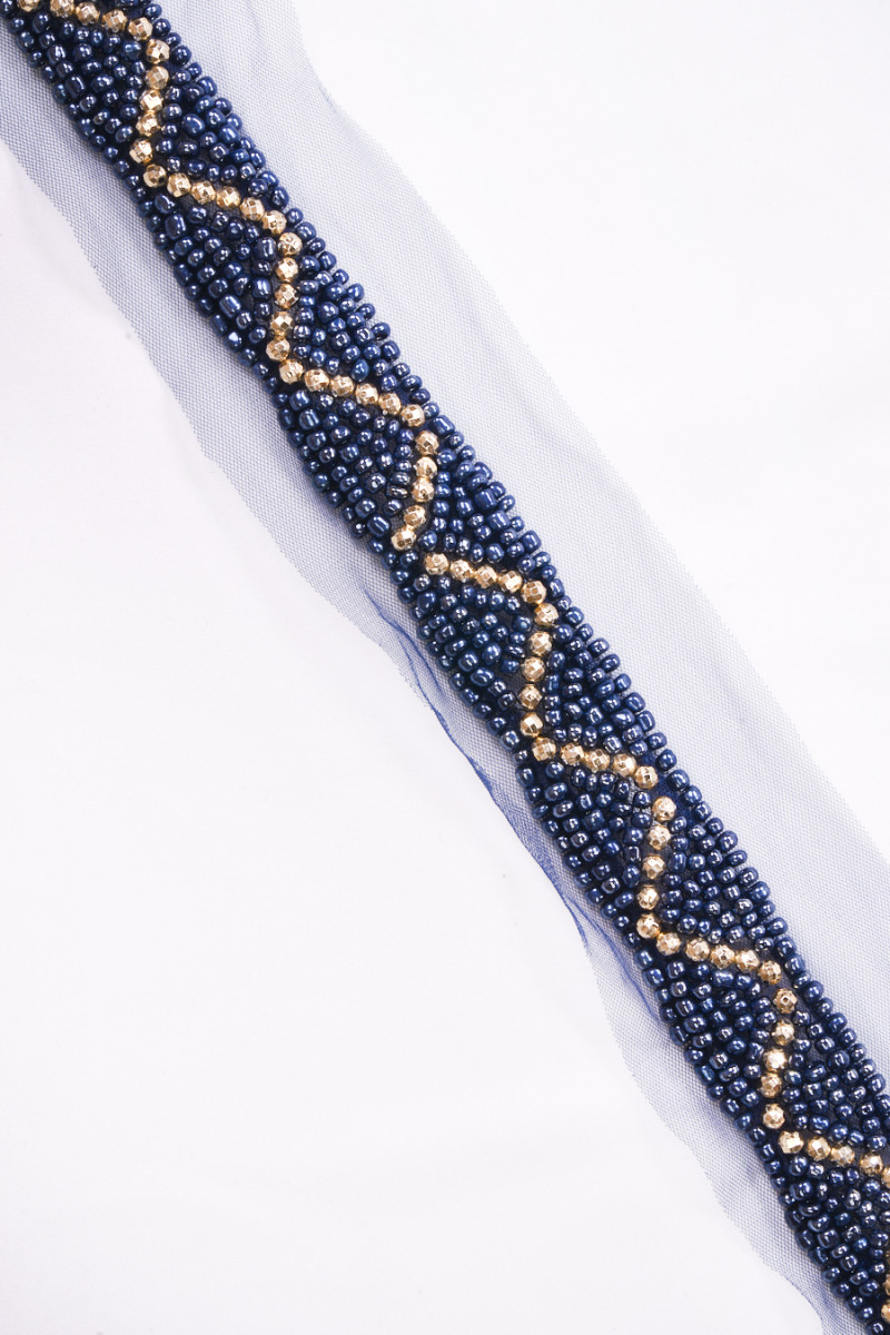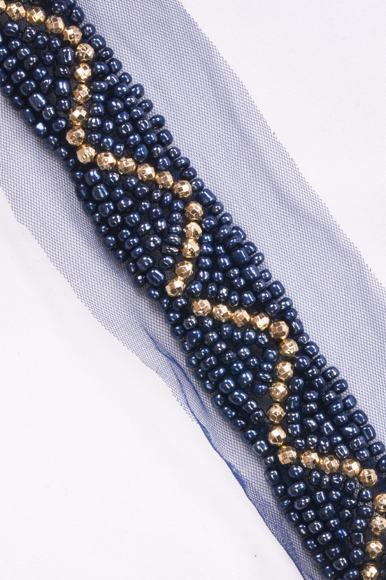 Italian navy blue haberdashery tape, 3.3 cm wide, richly decorated with beads. The tape is made of two types of navy blue and gold beads, which form a zigzag. The whole is sewn on a navy blue tulle mesh. A beautiful proposition to decorate an elegant dress, blouse or skirt.