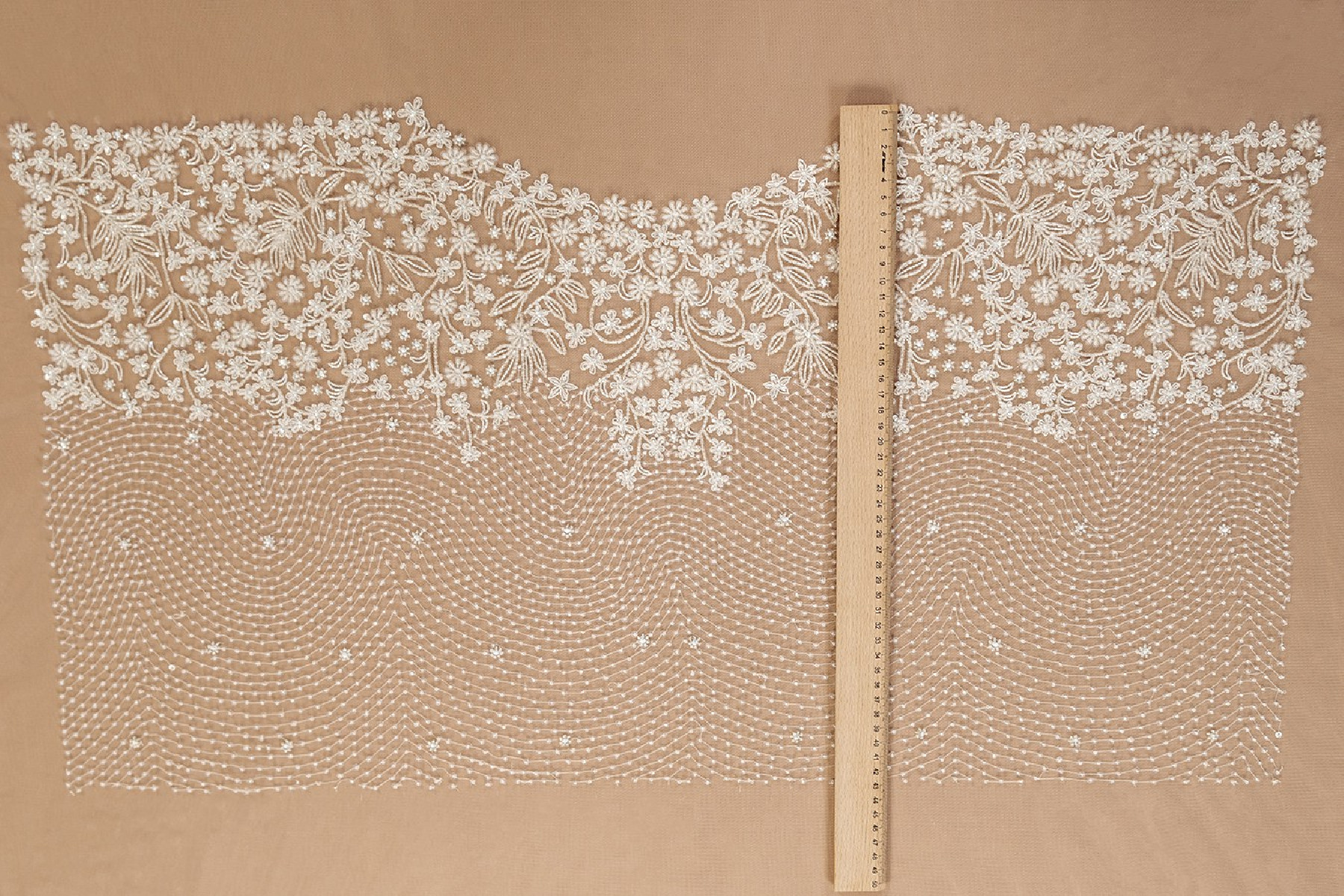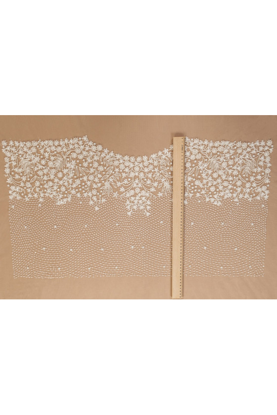 Italian wedding application in the form of a corset (blouse - front) in cream color. The top of the application is decorated with small flowers from beads and sequins that subtly pass into densely woven, small beads. The whole is sewn on soft tulle.