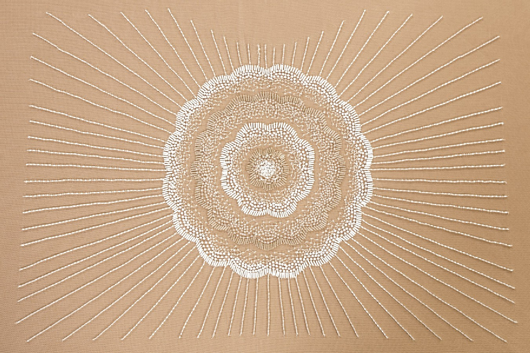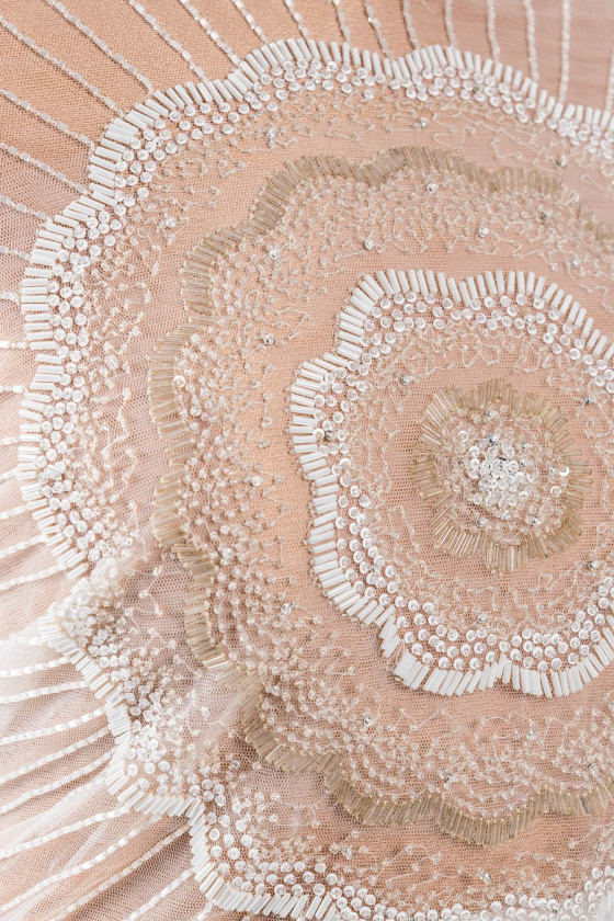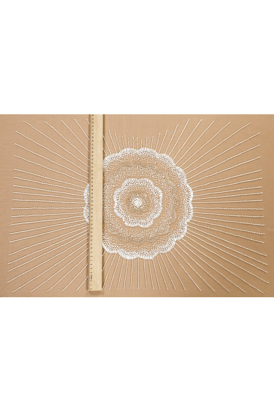 Italian wedding application in the form of a corset (blouse - front) in cream color. Small, transparent beads form a pattern resembling the rays of the sun. In the middle of the application there is a large flower (27 cm) of white sequins and pearlescent and transparent beads. The whole is sewn on soft tulle.