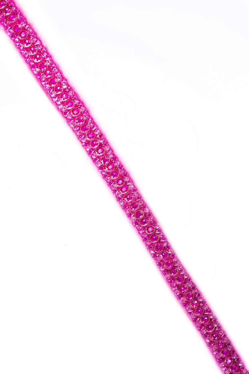 Italian haberdashery tape in a coupon with a length of 50cm and a width of 2.5 cm. A beautiful pattern of large, fuchsia jewels embedded in metal in the color of old gold, along them there are smaller diamond-shaped stones in the color of fuchsia and round, light pink stones finished with a small bead. The whole is sewn on fuchsia polyester chiffon. A very elegant proposition to decorate a dress or blouse. If you need 1m tape, order 2 coupons.
