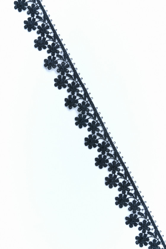 Italian haberdashery tape - guipure in black with a width of 3cm. A beautiful motif of small flowers and leaves connected at the top with a stripe. A fantastic proposition to finish smooth fabrics.