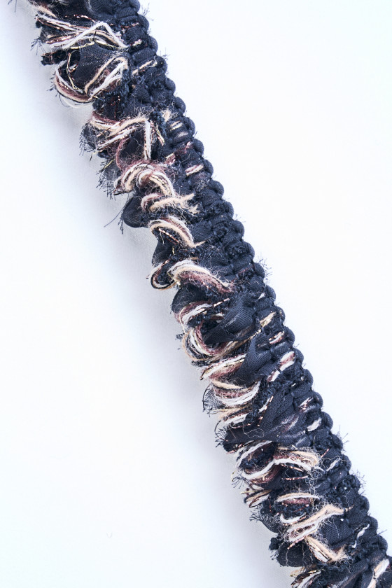 Italian chanel haberdashery tape with a width of 3 cm. A very interesting combination of black polyester chiffon and woolen threads in black, brown, cream and gold lurex thread. The whole is sewn on one side and creates a beautiful frill. The tape will look fantastic as a finish for chanel fabrics.