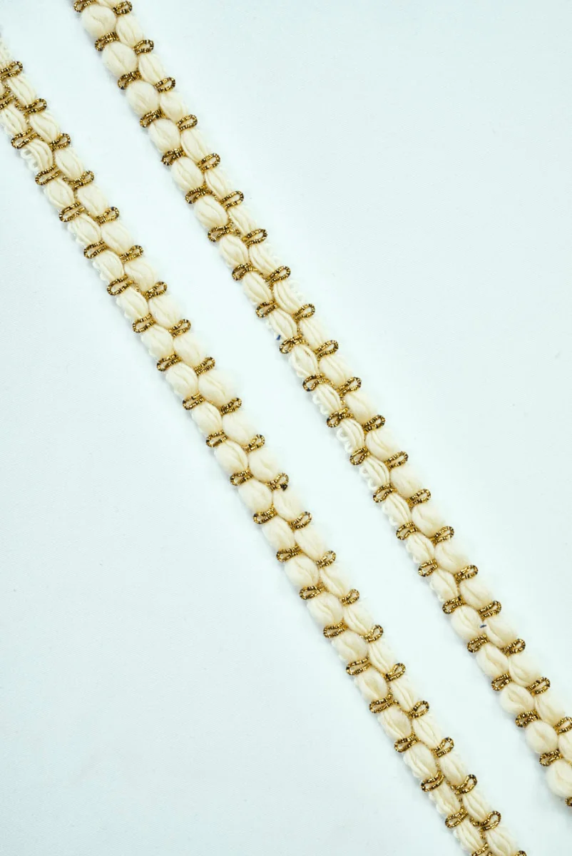 Italian haberdashery tape of the chanel type in cream color with a regularly woven gold thread. The tape is 1.5 cm wide, soft and non-elastic. Ideal for finishing chanel fabrics.