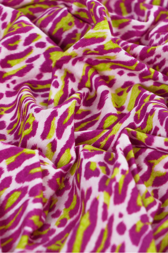 Italian cotton knit with a panther motif in the most fashionable colors of the season - fuchsia and sharp green on the background in ecru color. Knit elastic, soft, very pleasant to the touch - ideal for sewing a blouse, t-shirt, dress.