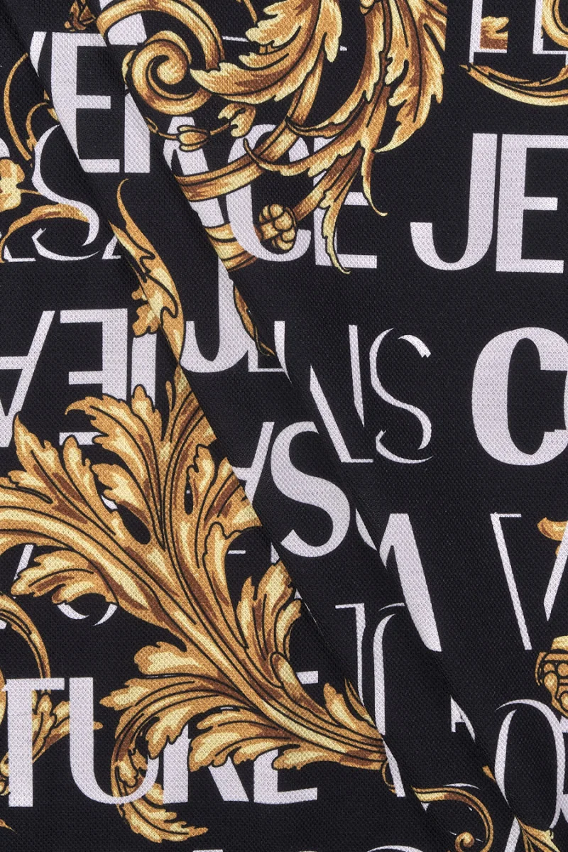 Italian viscose knitted fabric with a pique weave - black with white inscriptions and gold ornaments. Signed with the name of a well-known Fashion House. Soft, elastic knitted fabric - perfect for sewing a blouse or t-shirt.