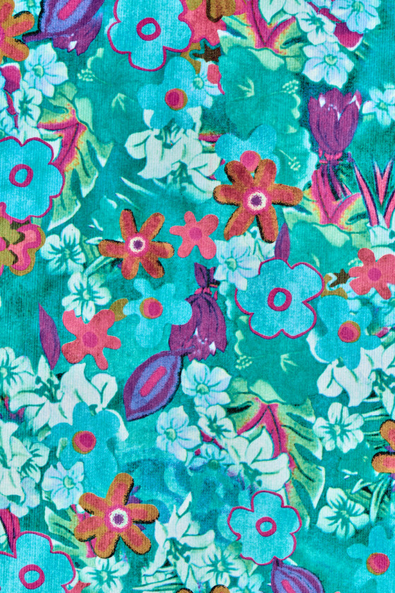 Polyester knitted fabric with colorful flowers on a turquoise background. The knitted fabric is opaque, medium-thick, flowing and ribbed. The dense, floral pattern in energetic colors is perfect for summer clothes such as dresses, blouses, tunics, pants and shorts.