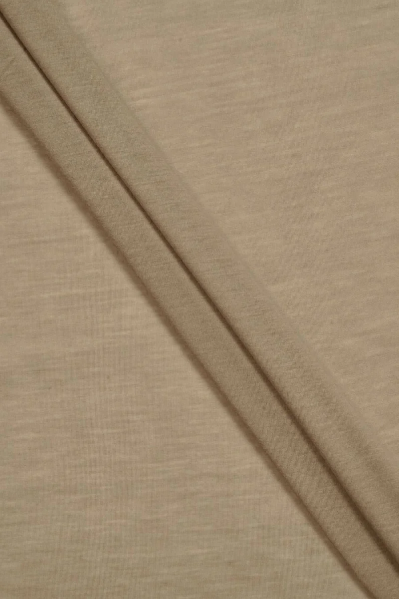 Italian polyester knitted fabric in dark beige color. The knitted fabric is thin, transparent, soft, matte and elastic. We recommend it for blouses, tops, T-shirts, you can also use it as a lining.