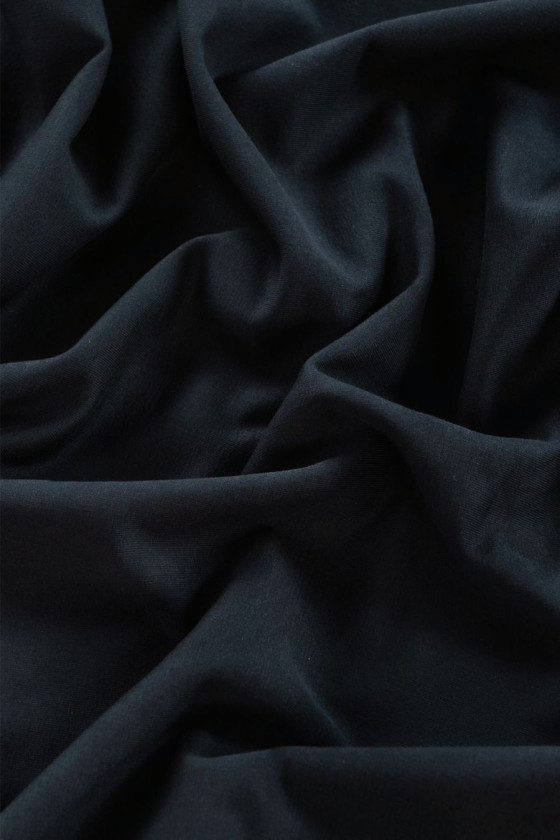 Italian polyester jersey in dark navy blue, almost black. A knitted fabric with a tight weave, medium thickness, with a delicate shine and elastic. It is perfect for sewing everyday clothes, such as dresses, skirts, tunics or light sweatshirts.