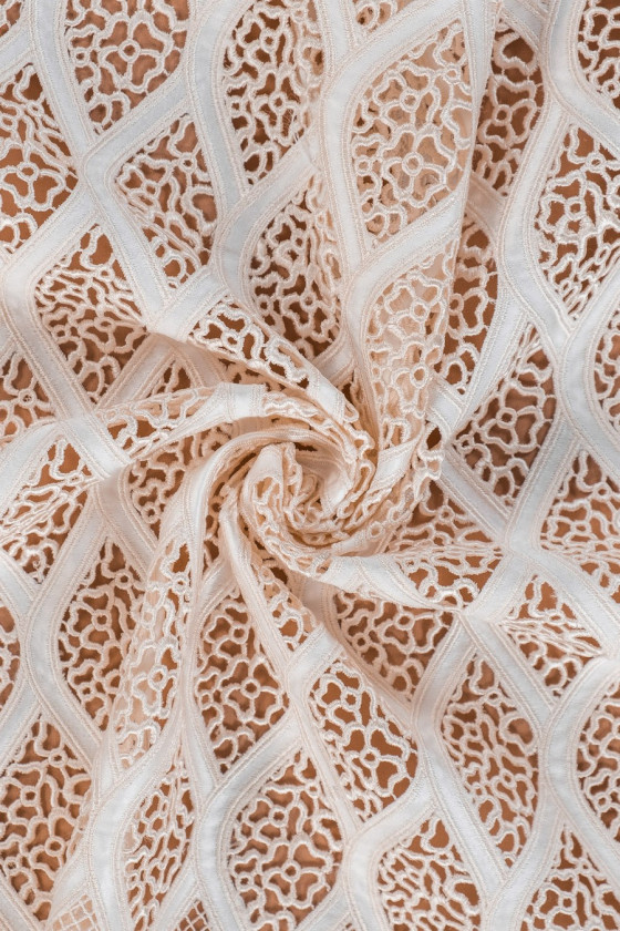 Italian guiur lace in ecru color with satin inserts in cream color. Very interesting motif of waves filled with flowers. Lace on both sides finished with a tooth (asymmetric) - the pattern occurs peripherally. Note the lace is 58 cm wide.