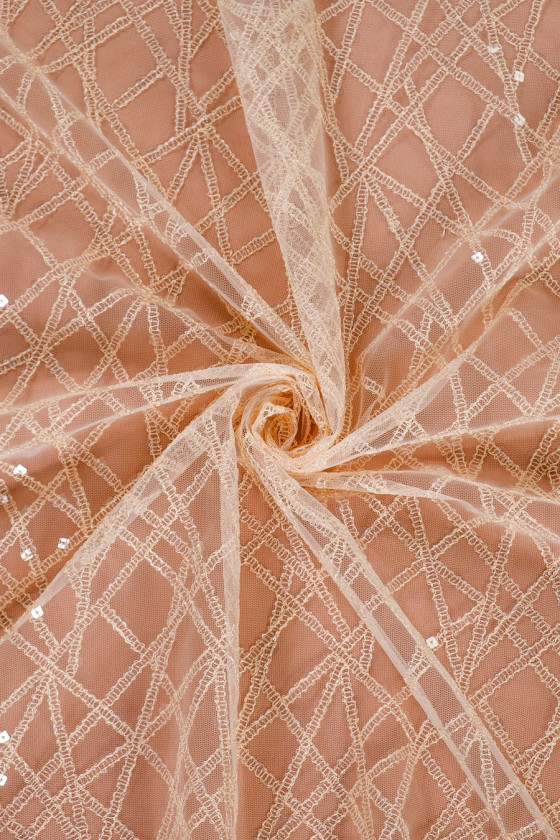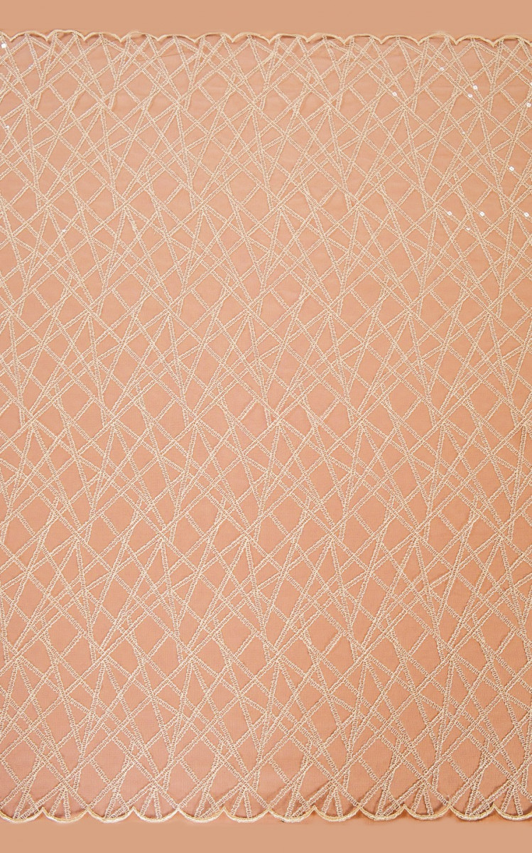 Italian lace in light beige with an interesting geometric motif decorated with transparent sequins. The lace is finished with a tooth on both sides. Width: 100 cm.