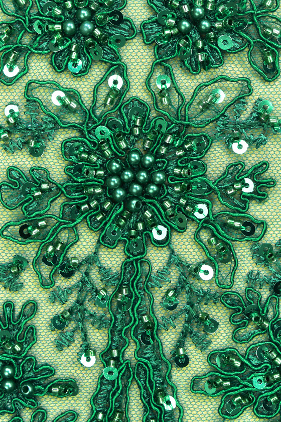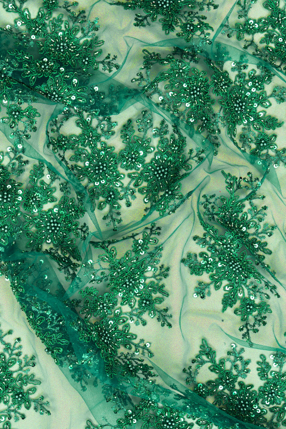 Italian lace evening fabric in green, made of tulle in the same color with evenly embroidered floral motifs of 10 cm * 20 cm. It is richly decorated with green sequins, beads and pearls and trimmed with a green string that makes the pattern slightly convex. The edges of the fabric are finished with a wide, decorative tooth - we sew it circumferentially.