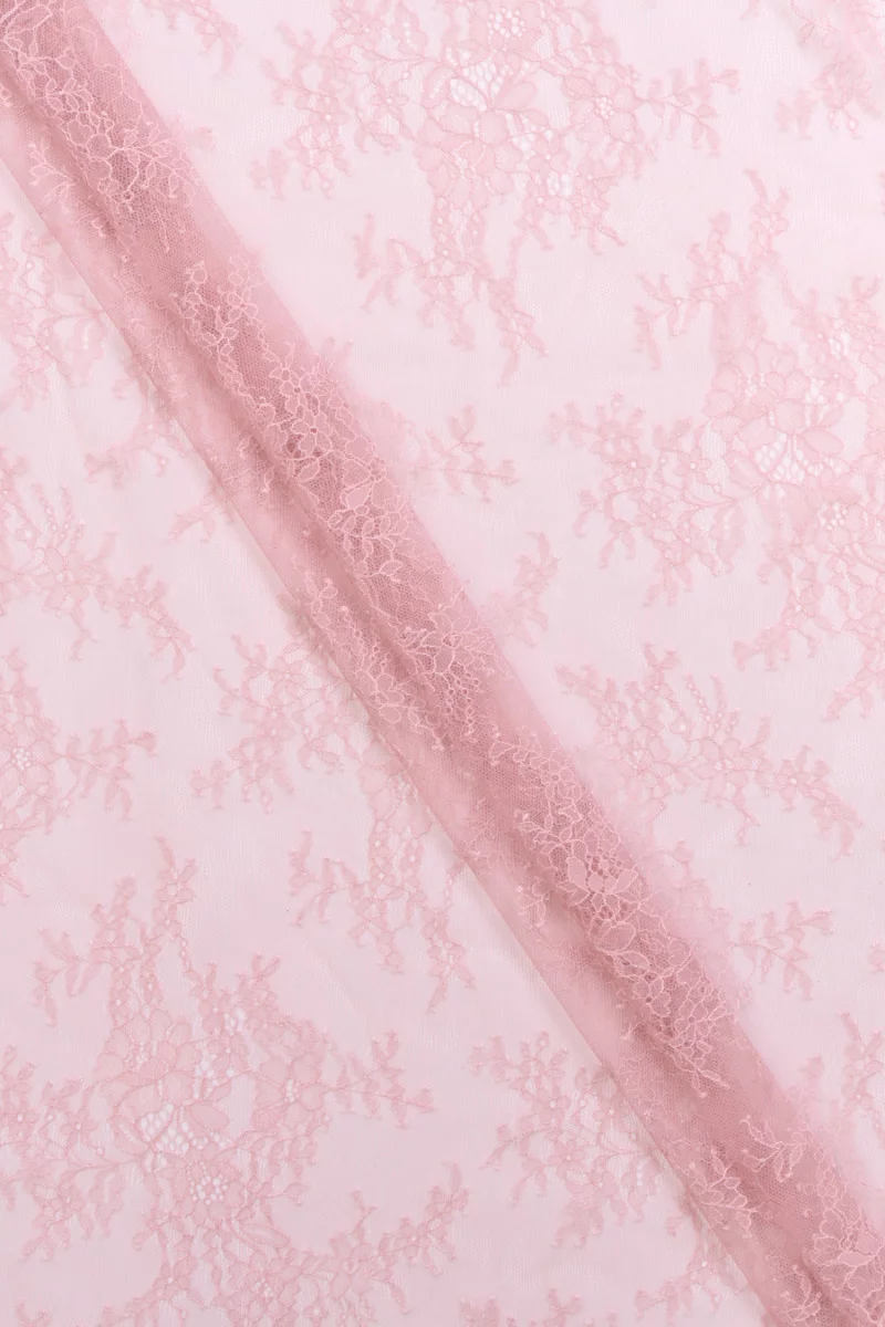 Italian, delicate French lace in dirty pink color. The lace is soft, transparent, pleasant to the touch, finished with a decorative tooth on both sides, inflexible, but gently works on the threads and drapes nicely. We recommend it for blouses, inserts and elegant underwear.