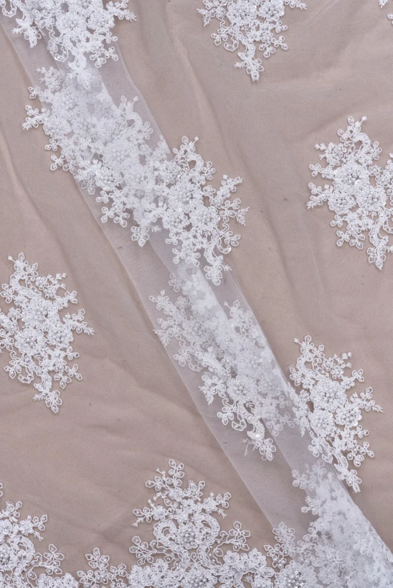 Italian off-white lace evening fabric, made of tulle in the same color with uniformly embroidered floral motifs of 9cm*14cm. It is richly decorated with cream beads and pearls, silver sequins and trimmed with a string that makes the pattern slightly convex. The edges of the fabric are finished with a wide, decorative tooth with a width of 18 cm. We sew it circumferentially. Lace is perfect for sewing a wedding dress, and you can also use individual elements for finishing.