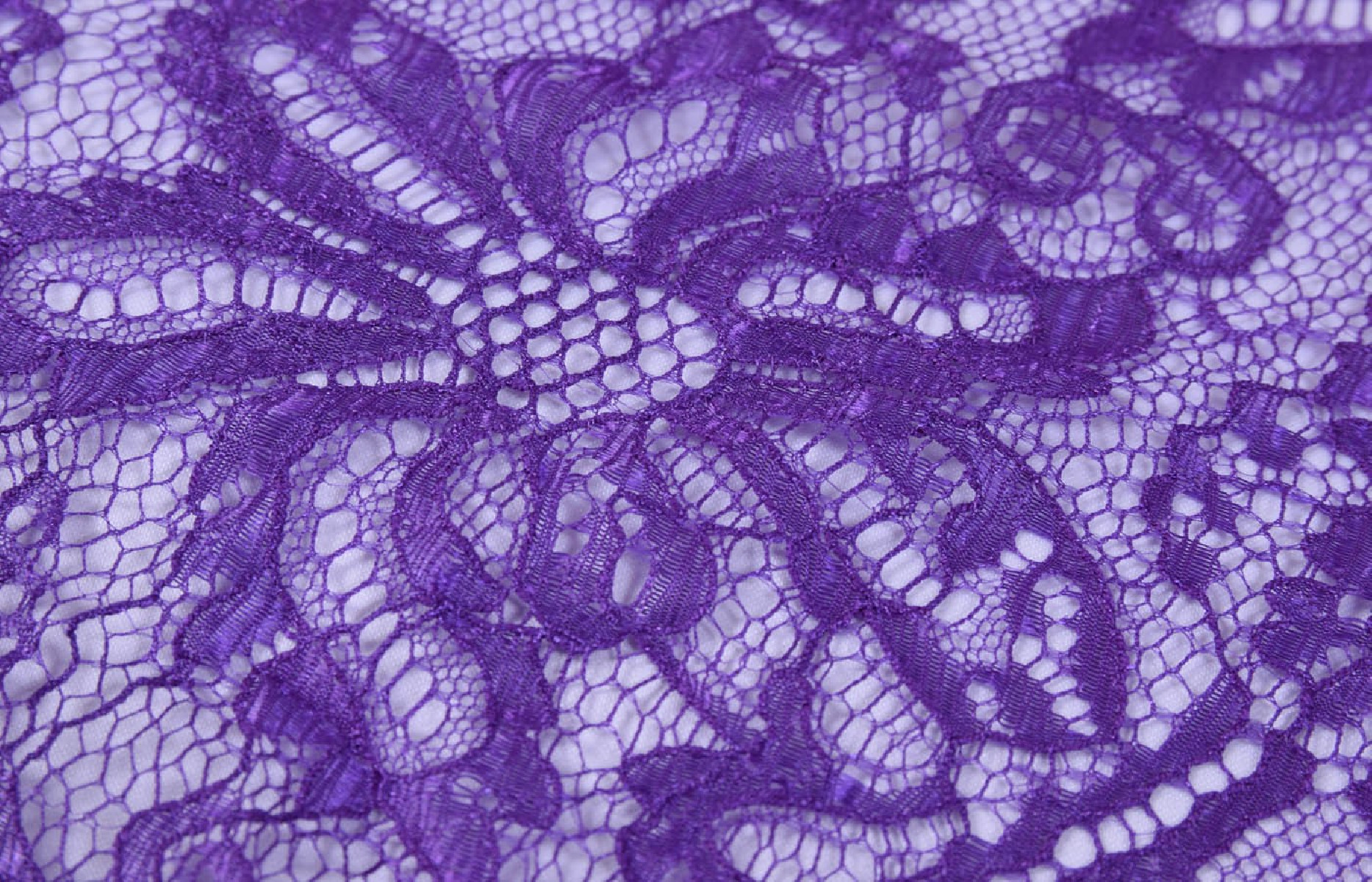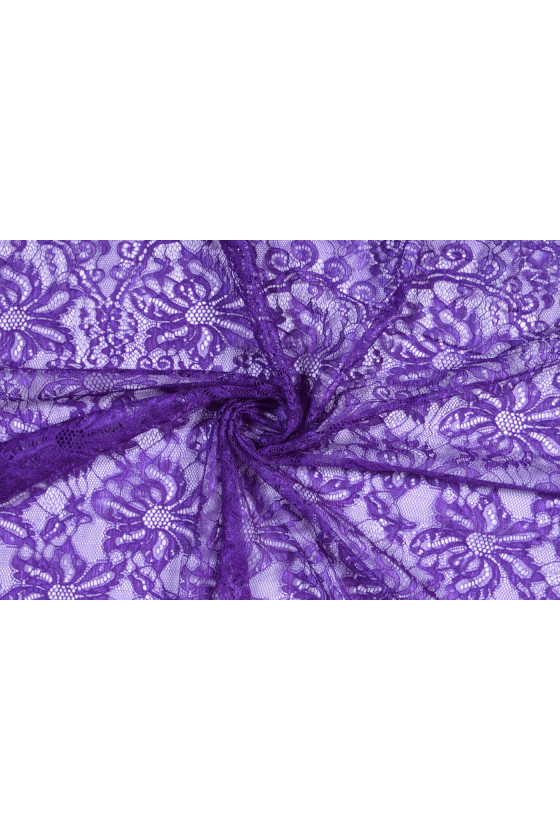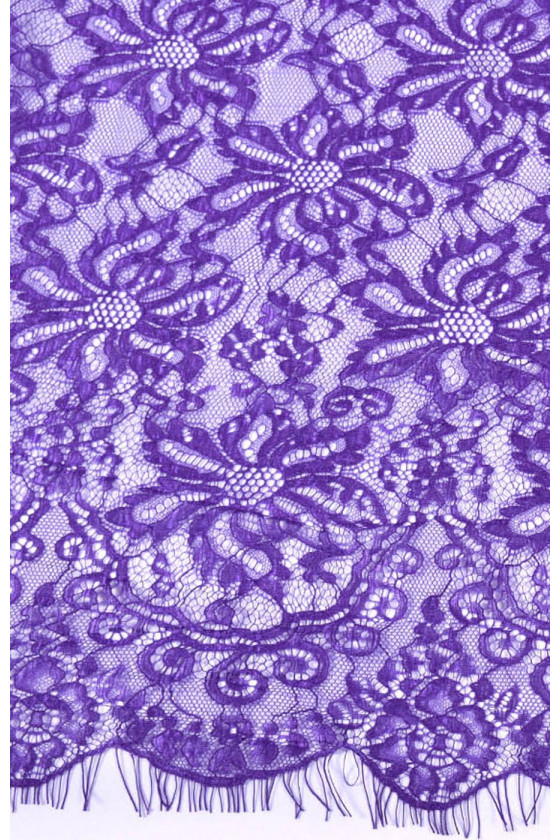 Evening lace in purple, comes in a repeatable coupon with dimensions of 110 cm * 150 cm. One-sided finished with a tooth, inelastic.
