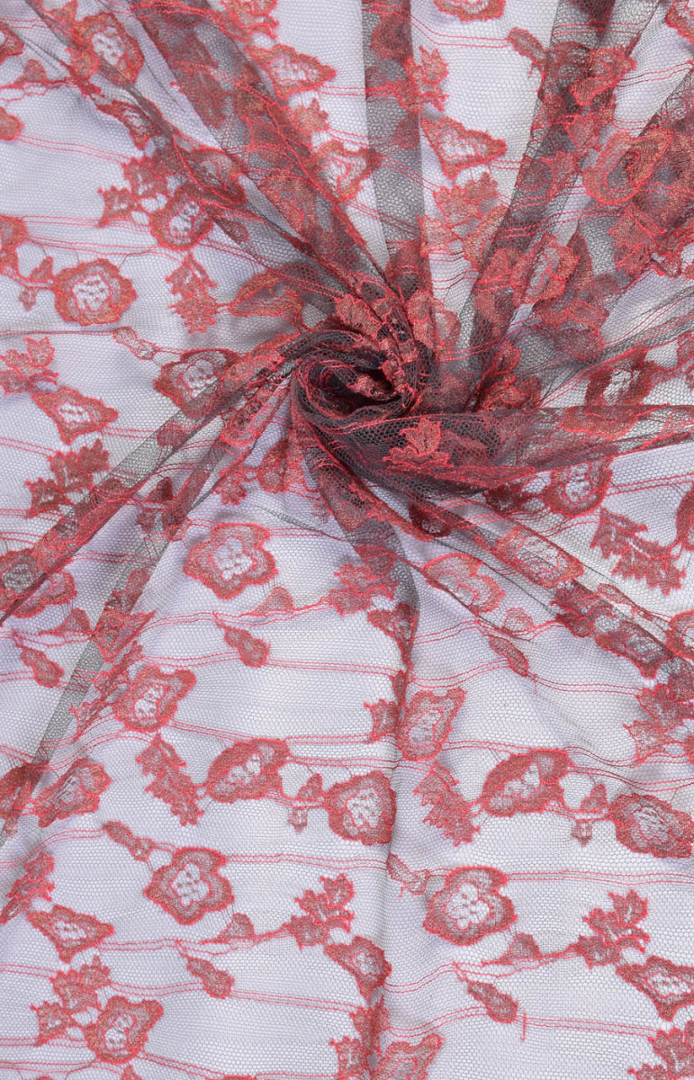 Thin, delicate lace in light burgundy and pink on black tulle. Both sides finished with a tooth. Delicate fabric. Perfect for blouses, dresses.