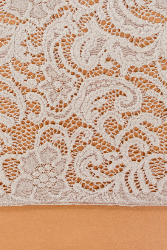 Lace in cold beige color with a convex floral pattern - it feels like it is made of wool.
