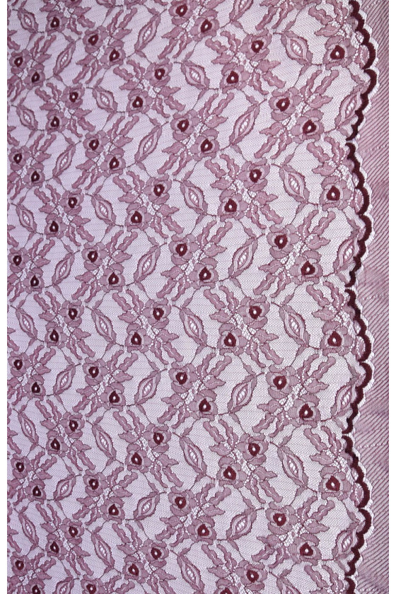 Italian evening lace fabric in burgundy color. Beautiful, dense floral motif, connected by a fine mesh. The fabric is very thin and delicate, finished on both sides with a decorative tooth (for self-cutting). A beautiful proposition for people who appreciate elegant, classic fabrics in darker colors.