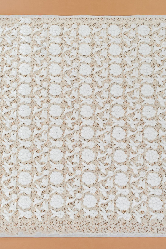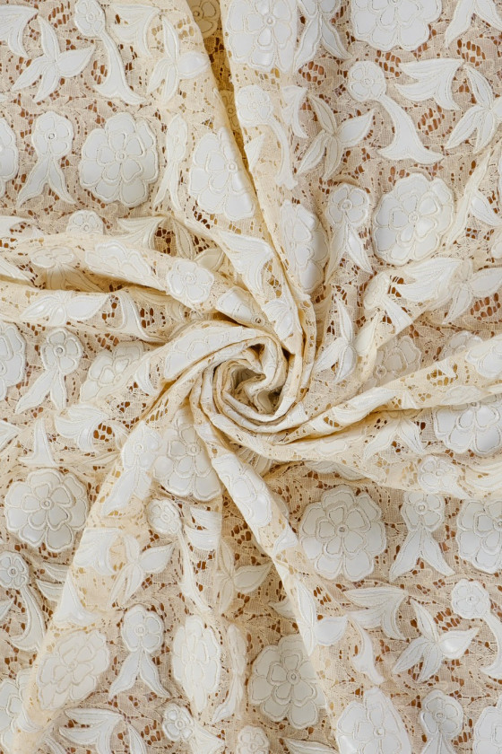On a creamy (light beige) lace sewn flowers of white ecodermis. Fabric for dresses, blouses and skirts. Inelastic fabric.