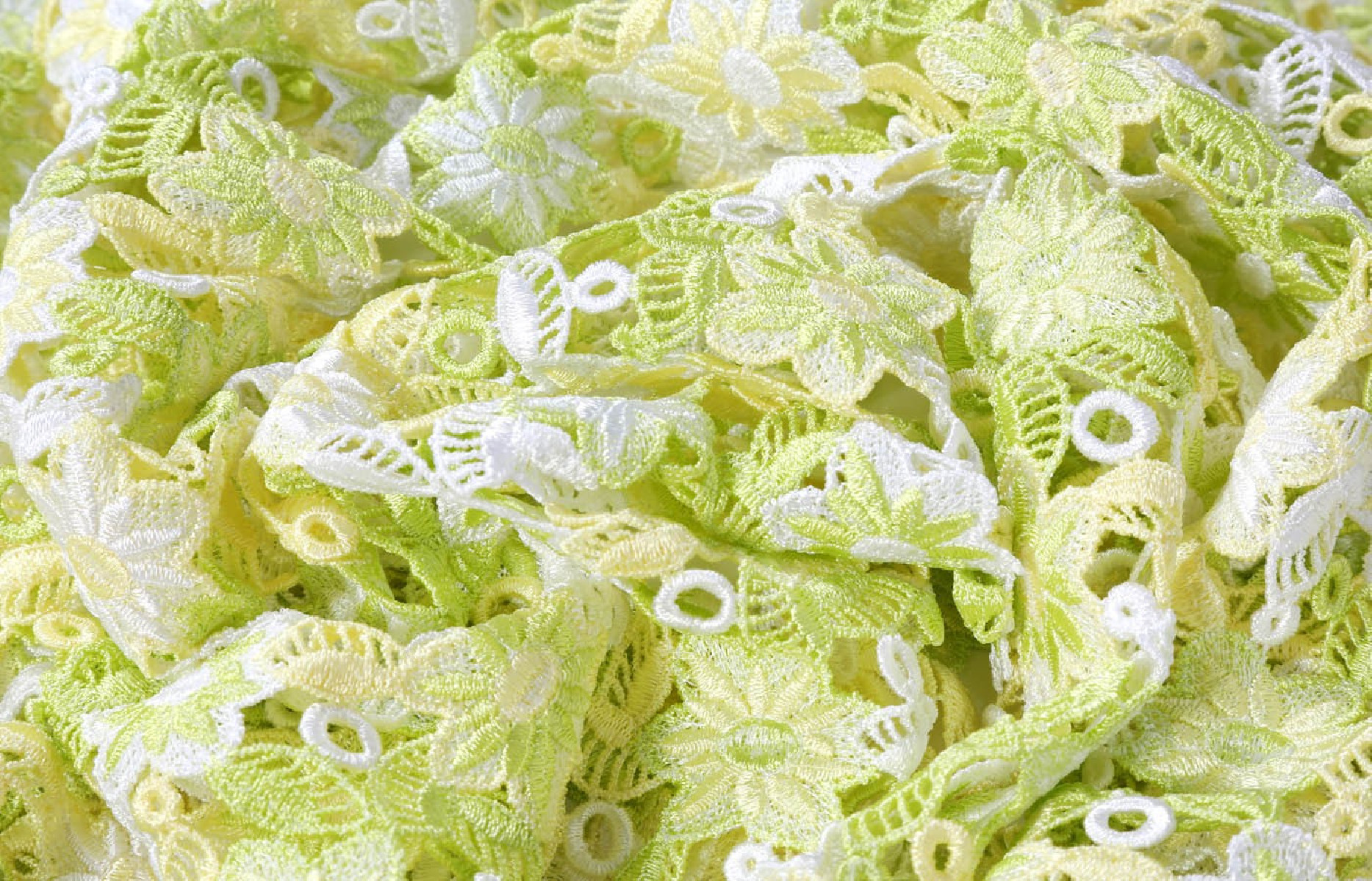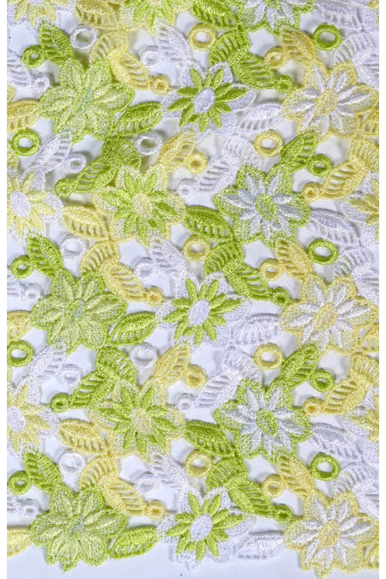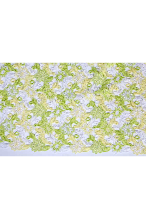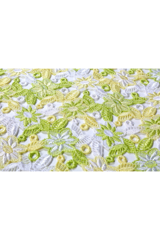 Beautiful guipure lace with a floral pattern. Spring colors give it freshness. Perfect for blouses or dresses.